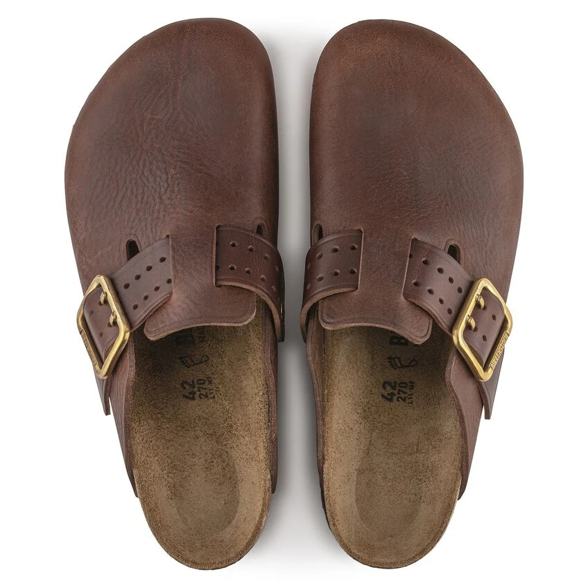 The signature slip-on clog from BIRKENSTOCK – the Boston. A casual-wear staple that is perfect all year round with a simple, adjustable design and contoured cork footbed that forms to the shape of your foot. This modern version of our iconic Boston clog features a double prong brass tonal buckle and a high traction rubber outsole. The cushioning midsole made from EVA promotes stability and comfort. Made of premium leather with edge embossing
