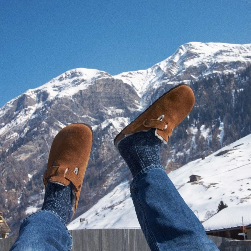The bolder, the better! This exceptionally cozy version of the Boston clog, a classic BIRKENSTOCK model, is made of real, very high-quality suede. The shearling footbed and strap lining exudes style and keeps feet warm. The perfect shoe for cozy winter evenings by an open fire!