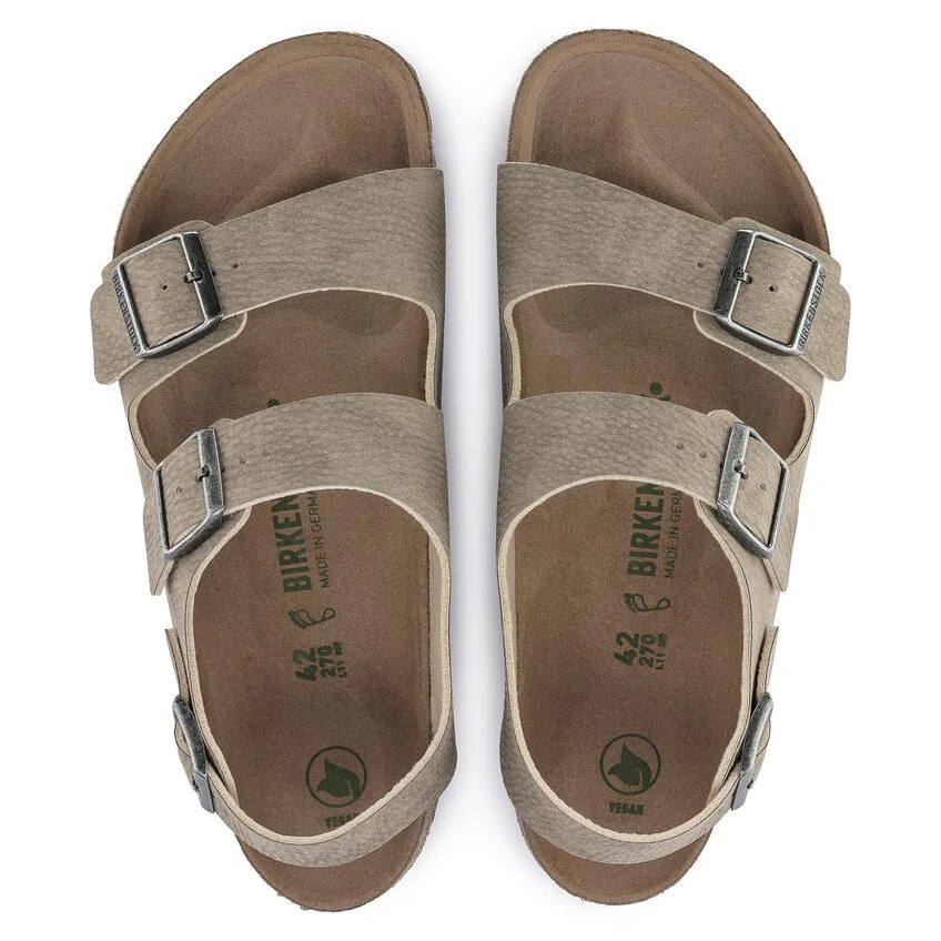 The BIRKENSTOCK Milano, now in vegan, features a compact design with an ankle strap. The metal pin buckles are individually adjustable with color-coordinated outsole. The upper is made from skin-friendly microfiber.